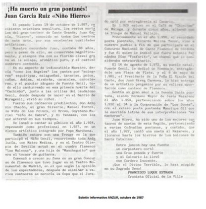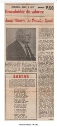 - Periódico Córdoba en 1986 de Miguel Jiménez, titulado “El Niño Hierro, con 87 años, le canta saetas al Terrible el Viernes Santo”.