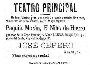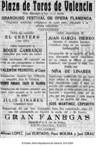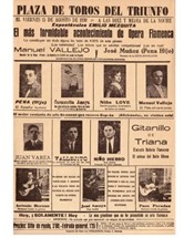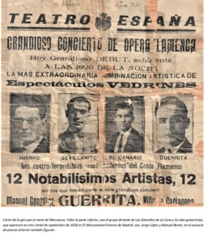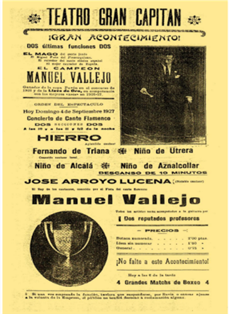 En este mismo año (1929), compartió cartel con Manuel Vallejo y Ramón Montoya el mago de la guitarra en Teatro Principal de Montblanc (Tarragona), como muestra el cartel publicado por el periódico El Progreso 20-4-1929.