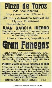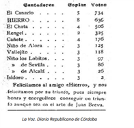 En Julio de 1927, el periódico local de Puente Genil “El Aviso” refiere en sus páginas: Nuestro paisano Juan García “Niño Hierro”, gana el segundo premio de cante en el Monumental Cinema de Madrid. En el Diario Republicano de Córdoba, La Voz, se anunció la puntuación final del concurso. Llamó la atención que cantara más coplas que El Canario que a la postre, se llevaría el primer premio.