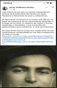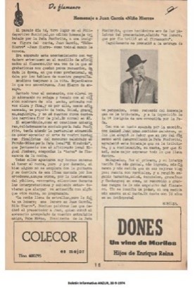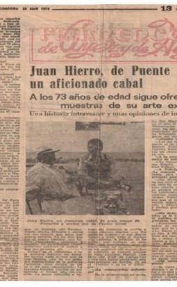 - Periódico Diario Córdoba, publicado el 22 de abril de 1972, en el que se recoge una larga entrevista personal “Juan Hierro, de Puente Genil. Un aficionado cabal” de Silverio de Córdoba. Y que se reedita en la Revista Anzur veinte años después tras su fallecimiento. En esta entrevista le preguntan ¿cuál considera que fue el mejor cantaor de su tiempo? Sin dudarlo comenta que “Manuel Vallejo, fue el mejor de su época. Tenía muchos cantes en la cabeza. Aunque entonces imperaban los fandangos, sus granaínas y seguiriyas eran fabulosas”. ¿Y en la actualidad? Comenta Juan que “el más completo es su paisano Antonio Fernández Díaz “Fosforito”. Y que ha influido de modo determinante en este despertar del flamenco. Por ello es una de sus mayores figuras”