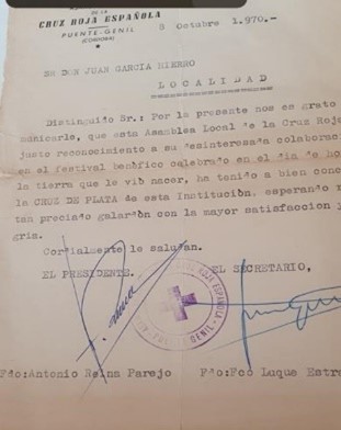Cruz de Plata al Mérito de la Cruz Roja Española. Con nombramiento de Socio de Honor por su colaboración. Puente Genil. Abril 1971.