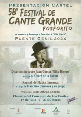 - Miguel Ángel Jiménez crítico de cante recordaba en Facebook: “En este 2019 se cumplen 120 años del nacimiento de uno de los mejores cantaores que ha dado Puente Genil. “Juan García Ruiz «Niño Hierro» (1899-1987, fue un auténtico ruiseñor, personalísimo tanto en la voz como en la forma de cantar. Fue profesional del cante en los años veinte, cuyo oficio dejó porque quiso después de haber compartido escenario con los mejores artistas de la Opera Flamenca. No me cabe duda de que, si hubiese permanecido en activo diez o quince años más, estaríamos hablando de un cantaor reconocidísimo ya que reunía todas las condiciones para haber sido figura”.