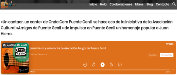 Pie de figura. – Entrevista a Álvaro de la Fuente, nuevo presidente de la “Asociación Cultural Amigos de Puente Genil”, en el programa «Un cantaor, un cante» de Onda Cero Puente Genil, donde se hace eco de la iniciativa de dicha Asociación Cultural, de impulsar en Puente Genil un homenaje popular a Juan Hierro.